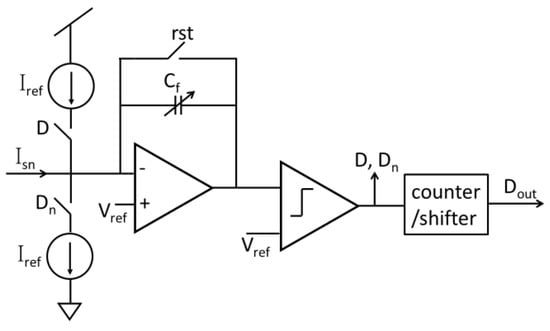 To capture and process sensor signals with digital circuitry, digitization of analog signals is important for features in many biosensor systems permitting efficient analysis and storage of sensor data. Many customized analog-to-digital converter (ADC) structures have been used with amperometric sensors, including sigma-delta (Σ∆) ADCs [56,67,70,71,87], integration ADCs [50,53,57,66,88], current-to-frequency (I-F) ADCs [47,89], successive approximation (SAR) ADC [72] and hybrid topologies [68]. Among these circuits, the incremental first-order Σ∆ ADC structures tend to have the best sensitivity (minimum linear response) of any class of ADC while remaining compact and consuming only microwatts of power. This ADC structure combines the benefits of integration ADCs with the noise shaping of Σ∆ ADCs and achieves superior performance for instrumentation and measurement applications [72]. The structure of a current-mode incremental first-order Σ∆ ADC is shown in Figure 12, where two current sources are used as reference currents in two directions to support a bidirectional input current. Many other efforts to improve Σ∆ ADC performance for amperometric sensors have been reported, including: replacing the traditional comparator with a hysteretic comparator to reduce substrate noise and achieve 50-fA sensitivity [56], using a digital modulation stage to expand the input current range by 32× without significant compromise to power and area [71,87] and reusing sensor capacitance as the amplifier feedback Cf to reduce the overall area [70]. Other ADC topologies, such as integration ADC, SAR ADC and I-F ADC, have traditional structures found in textbooks, but have seen limited use in CMOS biosensors because their noise performance is not as good as the incremental Σ∆ ADC.