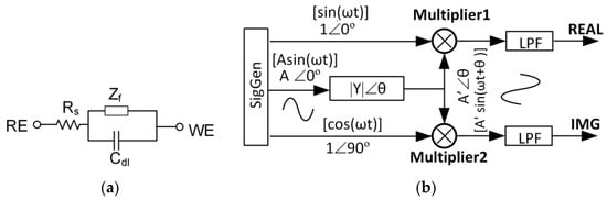 The operating principle of the FRA method is shown in Figure 13b where a known frequency sinusoid stimulus voltage Asin(ωt) is applied to the electrochemical transducer. The transducer’s response current is defined by A’sin(ωt + θ), where A’ and θ are determined by the transducer’s admittance. By multiplying the response current with two reference signals and then applying low pass filters (LPF), two orthogonal components, real (REAL) and imaginary (IMG), can be extracted, and these signal components are proportional to the real and imaginary components of the transducer’s admittance.