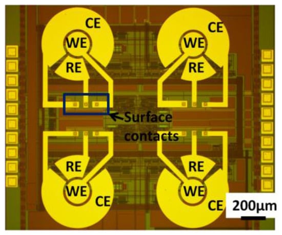 - Zhu, X.; Ahn, C. On-chip Electrochemical Analysis System Using Nanoelectrodes and Bioelectronic CMOS Chip. IEEE J. Sens. 2006, 6, 1280–1286. [Google Scholar] [CrossRef]