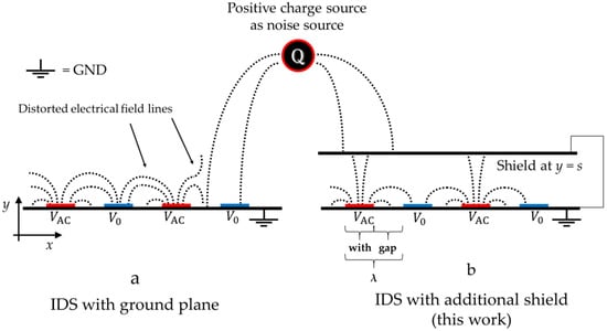 Working principle of a grounded shield. The arbitrarily positive source charge as noise source emanates an electric field which interacts with the IDS on the left hand side (a) whereas the shielded right hand side remains undisturbed from the external noise (b).