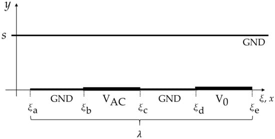 For the calculations in the presence of the two grounded planes (GND), the IDS has been simplified to its cross sectional view as depicted in Figure 2 showing one period of . The shield above the electrodes is located along the y-axis at y = s. The space between the active and neutral electrodes, labelled and , is set to V = 0 (GND), which is an approximation of having zero distance to the lower ground plane. As usually done, all geometries have no thickness and are infinite in the -direction [22].