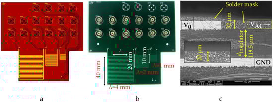 The employed multi-wavelength IDS board was produced via standard commercial multilayer PCB technology. This cost efficient solution was used as it allows rapid prototyping and testing of our sensor structure. The wavelengths , having a -ratio of 1, have been chosen as 1 mm, 2 mm and 4 mm based on previous literature [8,9,19,20,21] and considering that = 1 mm required a trace width of 250 µm which was a physical lower limit in standard PCB technology (Shenzhen JDB Technology Co., Ltd, Hangzhou, China). The geometry was kept as a simple square shape, the length l of the 20 (n = 10) electrodes were and respectively.