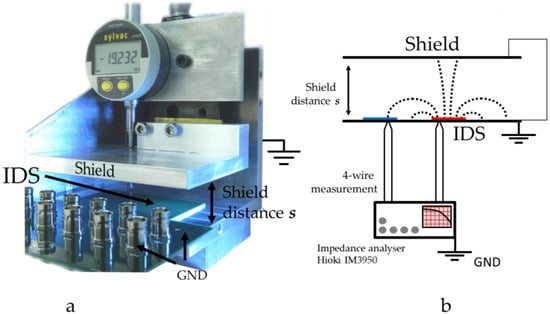 The experimental setup and its working principle is shown in Figure 4a,b, respectively. The machined construction covers and holds the IDS in place while allowing the shield distance s above to be varied. This position varied by a standard micrometer stage (PT1 from Thorlabs, Newton, NJ, USA) was read precisely via the installed digital micrometer. The rigid aluminum construction was grounded throughout the experiment to provide boundaries with . The IDS was smaller than the grounded xz-plane matching the assumption made to have the ground plane extended to infinity. The measurement was carried out via a four wire capacitive measurement through our Hioki IM3950 impedance analyzer (Hioki, Nagano, Japan). This four wire setup ensured precise and accurate measurements. The grounded aluminum construction served also as a Faraday cage, so that the measurement was less affected by external noise.