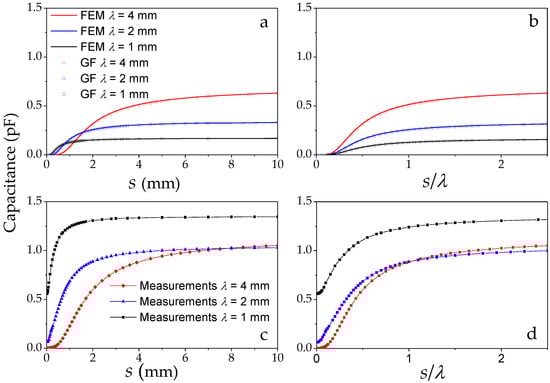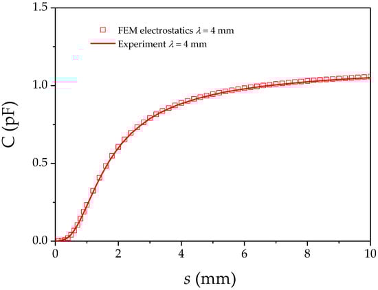 The s dependence of the capacitance calculated from Equation (4) was verified by FEM (Laplace module, Comsol Multiphysics 4.2, COMSOL, Burlington, MA, USA) applied to the same geometry as given in Figure 2. The calculations are shown in Figure 5a,b and plotted versus s and s/, respectively.