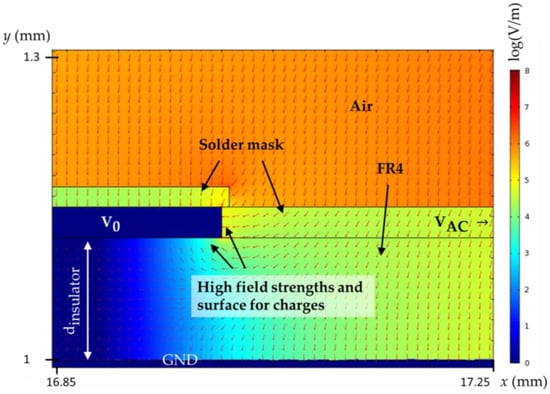This simulation of the IDS with could then be used to explore the nature of the parasitic capacitance and magnitude of capacitance compared to theory. Figure 7 shows the FEM simulation of the section in Figure 3c. The solder mask in Figure 7 is an additional dielectric between the air and the electrode which contributes to the capacitance. More significantly, the highest field strength adjacent to the electrode occurs in the gap between the active and neutral electrodes. This is the region covered by the solder mask and offers a surface for charges which was approximated to have zero thickness in the calculations. Also, some field lines from the active electrode are directed below the neutral electrode which agrees with the qualitative findings in the literature [19]. Thus, a large amount of the capacitance is occurring within the insulator material surrounding the electrodes instead of within the air above the sensor.