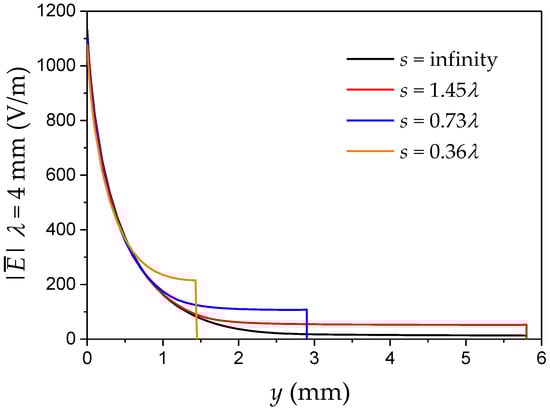 For = 4 mm and V = 1 V, the mean electric field strength across the sensor from Figure 6 could be plotted as a function of distance as shown in Figure 8. It shows the unshielded electric field and the shield position at , /2 and /4. The initial field strength is about 1100 V/m which is due to the gap between electrodes of 1 mm. Clearly, the electric field decays smoothly with distance and with increasing shield position it approximates the unshielded field distribution (the FEM y-boundary for the infinite shield distance condition was at s = 25λ).