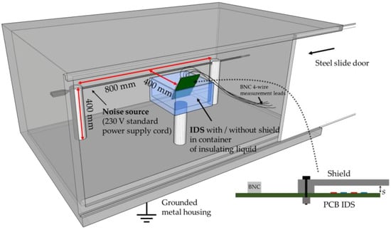 IDS are susceptible to noise caused by external electric fields in the environment. These external fields interact with the electric field of the electrodes. Detailed reports about noise and uncertainty is given in previous work [9,19,20]. Reducing this noise can be achieved in various ways such as averaging over long periods or improving the measurement devices. Surrounding the sensor with an electrically grounded Faraday cage, as suggested by other researchers [20], is one method to reduce such noise, without affecting other possible measures to improve precision.