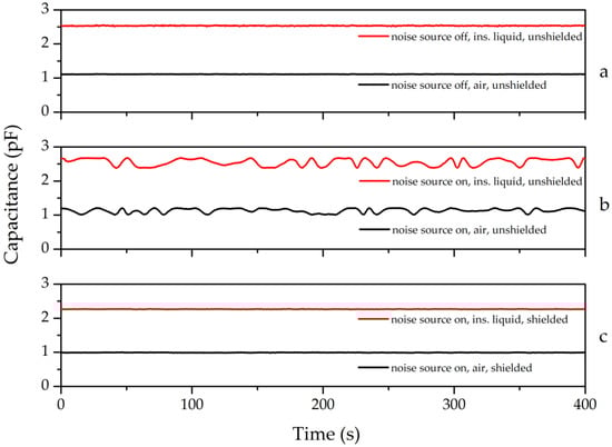 In order to analyze how the measured permittivity is affected by noise and shield, Table 3 shows the calculated values for using the mean values from Figure 11. Mere averaging over 801 data points seems to be an incomplete method to recover the value obtained without the noise source. With the noise source, the difference in capacitance remained 0.02 pF affecting the sensed value. Due to error propagation, the standard deviation for is higher than for the capacitance. Determining of the insulating liquid with high certainty is therefore difficult; the standard deviation, σ, without the shield was as high as 9.5% whereas the shielded standard deviation of 0.6% is similar to the measurement without the noise source.