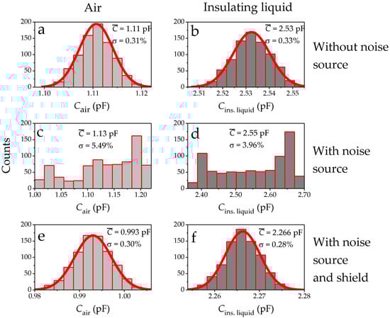 The distribution of measured values from Figure 10 have been plotted in Figure 11. The capacitance values for the IDS with media air (Figure 11a) and insulating liquid (Figure 11b), without noise source and unshielded, exhibited a Gaussian distribution. The mean values were air =1.11 pF (Figure 11a) and ins liquid = 2.53 pF (Figure 11b), with small fluctuations resulting in σair and σoil ≤ 0.35%. This behavior changed when the noise source was turned on. With the noise source, air and ins. liquid increases by 0.02 pF (Figure 11c,d) while σ increases by a factor of 12–18 relative to the measurement without noise source. The distribution becomes flat and non-Gaussian. The spread of measurement values is due to the inherent frequency fluctuations of the IDS sensing frequency (50.000 ± 0.001 Hz) and the fluctuations of the grid (noise source) frequency (50.00 ± 0.01 Hz) causing an aperiodic interference pattern as can be seen in Figure 10b. With the 3D shield, the lower σ values and the observed Gaussian distribution in Figure 11a,b could be recovered (Figure 11e,f). The mean values air and ins. liquid have changed due to the impact of the shield on the IDS capacitance. This change of −11.5% is equal for the air (c.f. Figure 11a vs. Figure 11e) and insulating liquid (c.f. Figure 11b vs. Figure 11f) as media. In summary, this histogram analysis shows that the shield reduces the external noise effectively.