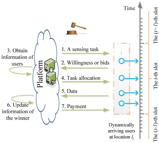 For simplicity, we assume that there is one sensing task that needs to collect data from all sensing locations L during T time slots. The platform divides the tasks into a set of spatio-temporal sensing jobs. For example, T sequential sensing jobs are required to be allocated for each location . Since users move around and participate in sensing intermittently, the platform requires selecting winners irrevocably in sequential auction rounds. Take one auction round for a job at sensing location during time t as an example: TOAM includes seven steps, as shown in Figure 2. We describe the procedure of our mechanism briefly as follows:
