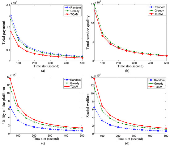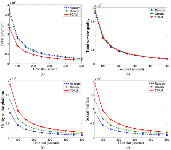 In Figure 3c, the utility of the platform in TOAM is 114.10% and 42.33% greater than that in random and greedy, respectively. This is because TOAM stimulates users to report their truthful costs with similar service qualities comparing with the other two schemes. The social welfare of the sensing system in the TOAM algorithm is 117.98% and 43.89% greater than that in random and greedy, respectively, in Figure 3d. As users are overpaid from the platform as rewards for submitting truthful prices, the increase is a little greater than that in Figure 3c.