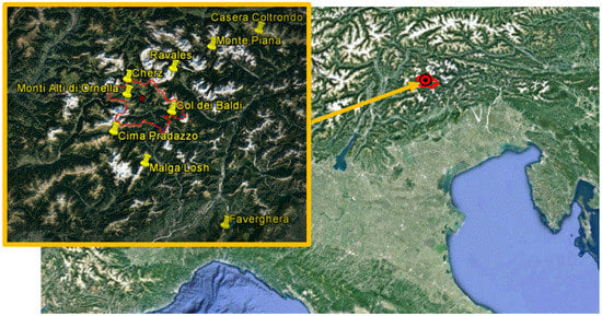 Cordevole basin in the North-eastern Italian Alps. Yellow placemarks indicate the meterological stations present on the area: (1) Col dei Baldi (1900 m a.s.l.); (2) Casera Coltrondo (1899 m a.s.l.); (3) Cima Pradazzo (2200 m a.s.l.); (4) Faverghera (1605 m a.s.l.); (5) Monti Alti di Ornella (2250 m a.s.l.); (6) Cherz (2100 m a.s.l.); (7) Ravales (2615 m a.s.l.); (8) Monte Piana (2265 m a.s.l.); (9) Malga Losh (1735 m a.s.l.). The red line represents the borders of the Cordevole basin.
