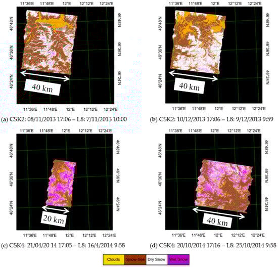 Four overlapped couples of CSK and L8 images of the Cordevole area acquired in different seasons, identifying the snow cover area and separating dry from wet snow. (a) November 2013; (b) December 2013; (c) April 2014; (d) October 2014. The size of the images is roughly 40 km × 40–50 km, except in (c) where the dimensions are smaller, 20 km × 40 km. Legend: white = dry snow, magenta = wet snow, brown = snow-free soil, yellow = clouds.