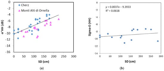 (a) σ° at X band in HH polarization vs. SD collected in Cordevole basin (Cherz and Monti Alti di Ornella) during winter seasons, 2012–2013 and 2014–2015. The obtained regression line is σ° = 0.027SD – 10.24 with R2 = 0.65. (b) σ° at X band in HH polarization vs. SD collected in Cordevole area during winter 2013–2014.