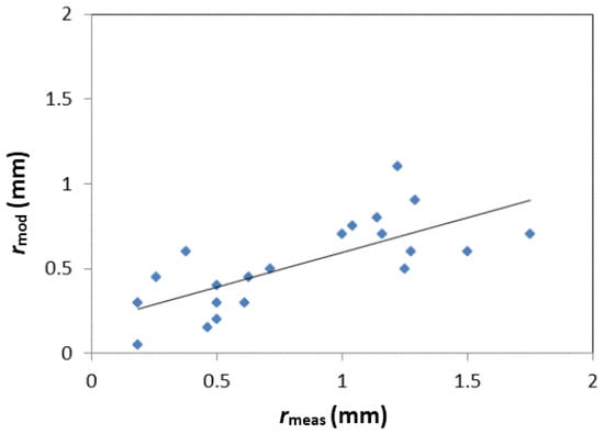 Simulated grain radius (rmod, in mm) as a function of the measured one (rmeas, in mm).