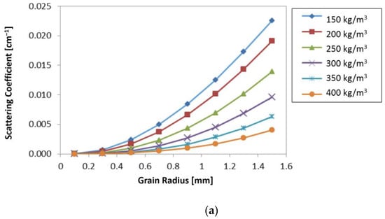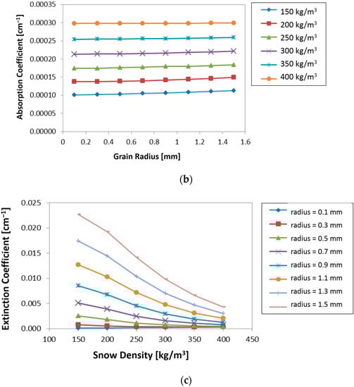 (a,b): Scattering and absorption coefficients, respectively, as a function of grain radius (in mm) for different values of snow density (150–400 kg/m3); (c) extinction coefficient vs. snow density for different values of grain radius (0.1–1.5 mm).