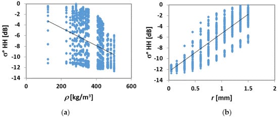 (a) σ° (HH) values vs. ρ derived from different SD values of the dataset collected on Monti Alti di Ornella. The obtained regression line is σ°= −0.017ρ − 1.16, R2 = 0.14; (b) σ° vs. grain radius, r. The regression line is σ° = 7.1r − 12.4, R2 = 0.78.