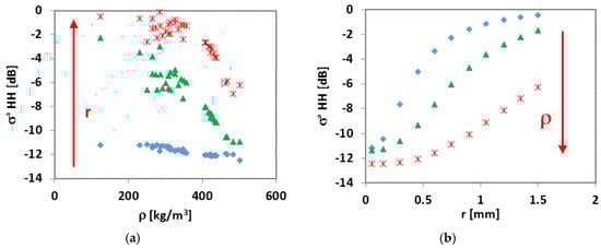 In Figure 6, σ° values were generated vs. ρ derived from different SD values of the dataset collected on Monti Alti di Ornella (a) and grain radius (r) (b). We can note that, although with a great spread of data, σ° tends to decrease with increasing ρ, and increase with increasing r, although the latter parameter seems to influence the backscatter in a more consistent way with respect to ρ, as it is pointed out by the higher slope and determination coefficient (R2 > 0.75) of the regression line (Figure 6b). By using selected values of both grain radius (i.e., 0.05 mm, 0.75 mm, and 1.5 mm) and ρ (i.e., 124 kg/m3, 300 kg/m3, and 500 kg/m3), respectively, the diagrams are transformed into those of Figure 7a,b. The trends of σ° definitely decrease as a function of ρ, and increasing as a function of r and are well separated for each selected value, thus confirming the theoretical trends of Figure 5. At smaller grain size (0.05 mm) and higher ρ (500 kg/m3), the trend of σ° is instead rather flat (Figure 7a,b).