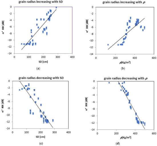 σ° (HH pol.) as a function of SD and ρ obtained by assuming a grain radius, r, increasing or decreasing with SD (a,c) and ρ (b,d), respectively.