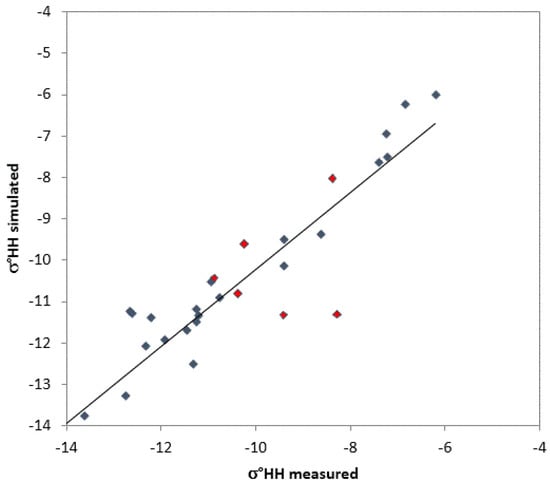 Simulated σ° (HH pol.) as a function of measured σ°. The obtained regression equation is σ°sim = 0.93σ°meas − 0.96 (R2 = 0.77, RMSE = 1.1 dB, p-value < 0.05). The backscattering values not sensitive to SD are shown in red (see Figure 3b).