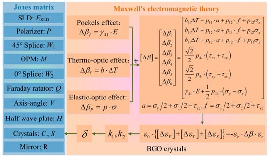 where E is the electric field intensity, ω is the angular frequency, μ is the permeability of the BGO crystal, and ε0 is the permittivity of the vacuum. The tensor form of the relative dielectric constant of the BGO crystal under the ideal isotropic situation is , where εr is the relative permittivity of the crystal. However, due to the Pockels effect, thermo-optic effect and elastic-optic effect, the ensuing variations of relative dielectric tensor ΔεP, ΔεT and ΔεS should be taken into account, respectively.