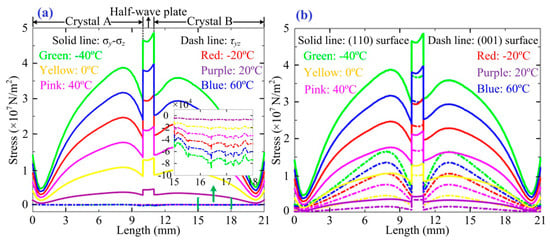 Based on the proof given in the Appendix A, we also simulate the distribution properties of (σy − σz) and τyz along the light propagation path, as shown in Figure 3. We can see that (σy − σz) is much greater than τyz that indicates the latter can be omitted. Meanwhile, the orders of magnitude of (p12 − p11) and p44 are 10−13 and 10−12, respectively [19], and we know that εyy − εxx = Δεyy − Δεxx = 2εr2·τyz(p12 − p11) and εxy·εyx = εr4·[γ41·E + p44·(σy − σz)/2]2. Then, we can conclude that (σy − σz) is the key factor that influences the OVS temperature stability.