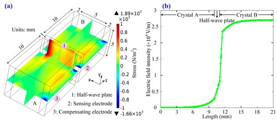 (a) The distribution of (σy − σz) in the designed dual-crystal sensing unit; (b) the distribution of electric field when the electrodes of the crystal B is applied with a voltage 1 kV.