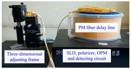 The designed dual-crystal voltage sensing unit and the Pockels transfer unit of OVS are shown in Figure 9b. In the configuration of Pockels phase transfer unit, the SLD is fixed on the metal base for exothermic convenience with room temperature variation to suppress light wavelength drift. The dual-crystal sensing unit is independently designed using the configuration depicted in Figure 4a. The voltage sensing unit can be separated to measure the voltage by the PM fiber delay line, so that the Pockels phase transfer unit can be placed in the room to avoid environmental disturbance.