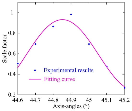 As shown in Figure 7, the first experiment is carried out to validate the axis-angle compensation method during the manufacturing process of OVS. The FR is placed in a three-dimensional adjustment frame, and is adjusted to ensure that the output light beam shoots the center of the end surface of the BGO crystal. Then, the axis-angle between the FR and the BGO crystal is rotated by adjusting the three-dimensional adjustment frame, and the interference light intensity at PIN-FET is observed. By real-time monitoring of interference light intensity of OVS, we can rotate the actual axis-angle (θ3) between FR and the BGO crystal, so that axis-angle compensation of θ3 offsets the unideal axis-angle of the half-wave plate in the sensor head. Figure 8 shows the tendency of scale factor with different axis-angles θ3. In the practical experiment, the larger interference light intensity means the larger scale factor and the smaller nonlinearity of the sensor, which is consistent with the theoretical analysis given in this paper.