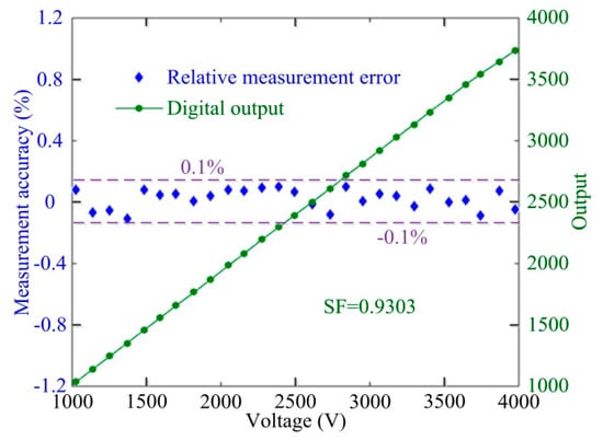 First, we conduct the scale factor () experiments at room temperature. As shown in Figure 10, the relative measurement error of OVS, as calculated by solving ζ = |(Uout/SF − U)/U × 100%| with digital output Uout, is less than ±0.1% when the applied voltages are over 1000 V. There is good linearity between the digital output and the input voltage, which also verifies that the proposed axis-angle compensation method is effective and the OVS measurement accuracy is therefore improved. Thus, the axis-angle compensation method can neutralize unavoidable axis-angle errors of optical components in the manufacturing process for optimizing the measurement precision of OVS.