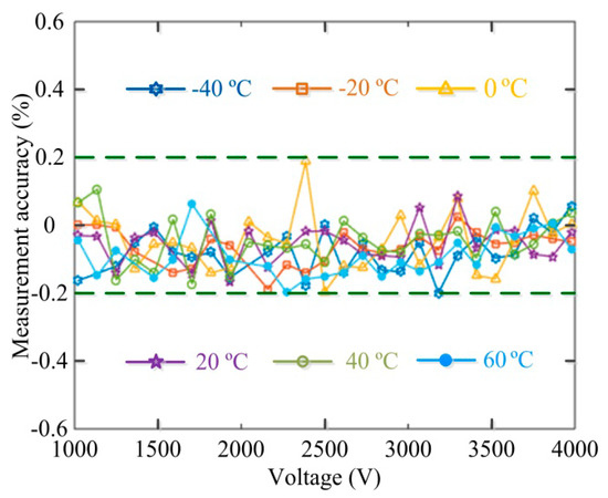 Further experiments are conducted to test the temperature stability in the temperature range from −40 °C~+60 °C. In these experiments, the dual-voltage sensing unit of OVS is put into a temperature-controlled chamber and the environmental temperature variation is monitored by temperature sensor. In the temperature dependence experiment, we measure the detection error of OVS for each temperature point with a temperature difference of 20 °C between adjacent point during −40 °C~+60 °C, and the experimental method is the same as that reported in [18]. The measurement accuracy of OVS within the temperature range of −40 °C~+60 °C is obtained as shown in Figure 11.