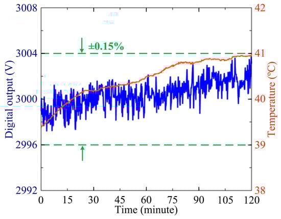 The long term measure stability of the sensor at 3000 V AC over two hours is also measured when the temperature is maintained at +40 °C by the temperature-controlled chamber as shown in Figure 12. The relative measurement errors of OVS are less than ±0.2% in the temperature range of −40 °C~+60 °C, which is much improved as compared with the value ±0.3% in the range of 0 °C~+60 °C reported in [18]. It is obvious that the temperature stability is greatly improved. The experimental results verify that the measurement accuracy of OVS satisfies the demand of IEC 60044-7 for 0.2-level measurement [20]. In particular, the novel sensing scheme could be applied in the engineering system of OVS to improve the performance of the sensor in a smart grid.