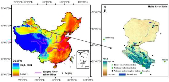 Because of the scarce water resources in this basin, a large number of hydrology and water resources, environmental ecology, and land surface process research projects have been conducted in the region since 1989, such as Heihe Basin Field Experiment (HEIFE) [57,58], Arid Environment Comprehensive Monitoring Plan ’95 (AECMP ’95) [59], DunHuang Experiment (DHEX) [60], the Watershed Allied Telemetry Experimental Research (WATER) project [61], and the Heihe WATER (HiWATER) project [62]. A large body of ground observation data from meteorological, hydrological and energy flux stations and associated study results has been accumulated. This rich knowledge resource has laid the foundation for much of the scientific research in the Heihe River Basin, and also the high heterogeneity of the underlying surface and the strong seasonal weather changes in the Heihe River Basin can better test the feasibility of the new method proposed in this paper.