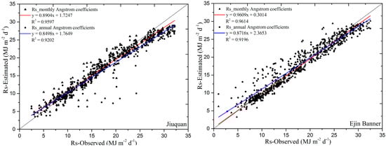 Comparison of the observed and estimated global daily solar radiation in 2008 (366 days) at Jiuquan (left) and Ejin Banner (right).