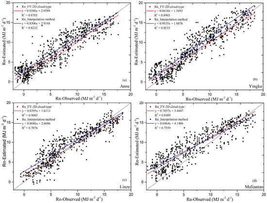 After developing the daily solar radiation method and the calibration of the daily longwave radiation, the improved net radiation equation and the final parameters can be obtained. The 2008 ground data were used to validate the estimated daily net radiation. At the same time, an inverse distance weighting (IDW) interpolation method [79] was used to estimate daily sunshine duration, which was then applied to estimate the daily net radiation based on the method proposed in this paper instead of the sunshine duration calculated by the hourly FY-2D cloud-type data. The performance of the proposed method based on the sunshine duration from hourly FY-2D cloud-type data and station interpolation method is presented in Figure 3 and Table 6. Compared to the validation results between estimated daily net radiation based on the sunshine duration from station interpolation method (Rn_Interpolation method) and the observed values, the coefficients of determination (R2) between the observed values and the estimated values based on the sunshine duration from hourly FY-2D cloud-type data (Rn_FY-2D cloud-type) have a higher value, which were 0.8703, 0.8903, 0.9003 and 0.8489 at Arou, Yingke, Linze and Maliantan, respectively. The maximum R2 value is 0.9003, and the average is 0.8489, indicating a strong correlation between the observed and estimated values (Rn_FY-2D cloud-type). The indexes of agreement (d) at Arou, Yingke, Linze and Maliantan are 0.9518, 0.9684, 0.9771 and 0.9231, respectively, which also suggest good performance again. The NSE values at Arou, Yingke, Linze and Maliantan are 0.8279, 0.8837, 0.9160 and 0.7147, respectively. The maximum NSE value is 0.9160, and the average value is 0.8356. The higher values of d and NSE again indicate that the daily net radiation estimated by the proposed method (Rn_FY-2D cloud-type) correlates well with the in situ daily net radiation. The MBE, MAE and RMSE values determined at these four stations show that lower MAE and RMSE values from Rn_FY-2D cloud-type than the results by the Rn_Interpolation method are correlated with the existence of fewer outliers in the estimated daily net radiation values.