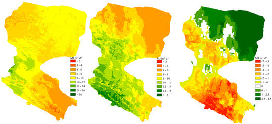 Spatial distribution of daily net radiation (MJ·m−2·d−1) estimated using sunshine duration-IDW (left); the proposed model (middle) and the difference between both methods (right) over the Heihe River Basin in 16 July 2008.