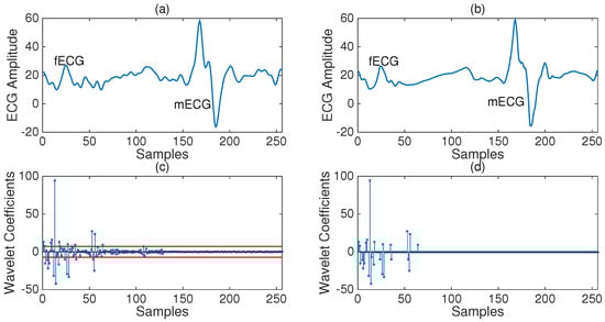 (a) original ECG signal and (c) corresponding wavelet coefficients, the lines correspond to the threshold level to select the 10% largest coefficients; plots (b,d) show the reconstructed signal and the 10% largest coefficients used for reconstruction.