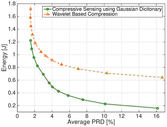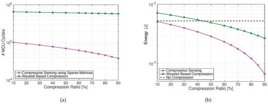 In terms of energy, results in Figure 3b show that compressive sensing is more energy-efficient than transmitting the uncompressed original signal (for one signal block, ) for compression ratios CR > , while the DWT-based compression becomes favorable for CR > . Figure 3a,b also show that when increasing the compression ratio, the gap between the two compression techniques increases, leading to higher energy-saving for the CS-based method. It is clear that CS allows for reducing the encoding complexity in the sensor node, allowing a reduction of the overall energy consumption.