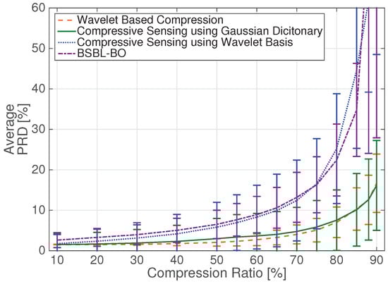 Average PRD values for different compression/ reconstruction schemes. Error bars indicate standard deviation.