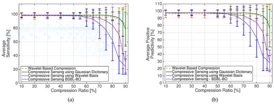 To compare how well the different techniques can preserve relevant signal characteristics, Figure 5a,b show the average Sensitivity and Positive predicitivity measures obtained from the application of the detection algorithm on the reconstructed signals.