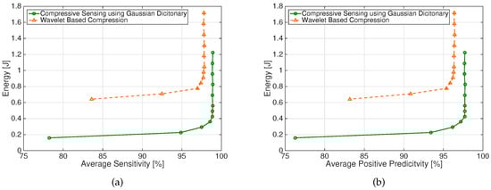 It is apparent from Figure 6 and Figure 7a,b that the considered CS scheme allows significant energy saving for all the considered figures of merit. For instance, for PRD = 9%, less than 0.3 J are required by the CS scheme, while the DWT-based scheme requires about 0.7 J. A sensitivity value S = 95% requires about 0.2 J and 0.7 J for DWT-based and CS schemes, respectively. Similar values are required to have P+ = 95% for the two schemes.