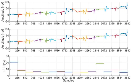 As a matter of fact, PRD values can provide, in some cases, a rough estimate of the signal quality, especially when the interest is preserving clinically relevant aspects. As an example, we report in Figure 8 one ECG trace and the corresponding PRD values for each signal block. It can be noticed that blocks with the largest PRD values do not contain relevant ECG information. Clearly, a noisy block cannot be sparse in the wavelet basis or Gaussian Dictionary representations, thus worsening the performance of CS-based schemes.
