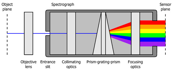 The measurements were performed with a SPECIM PFD V10E hyperspectral line camera (Oulu, Finland). The light captured by the objective lens passes through a narrow slit, after which it is dispersed by a diffraction grating and projected onto the camera sensor. A schematic overview of the hyperspectral imaging system is given in Figure 1. The resulting images contain the spectra of a large number of adjacent points on a line. This line has a thickness of 40 µm, a spatial resolution of 12 µm/pixel and counts 140 pixels, resulting in a total length of 1.7 mm. Each of the measured spectra contains information in the visible and near infrared (VNIR) region from 400 nm to 950 nm with a spectral resolution of 1.1 nm/pixel (). The images were captured with a bit depth of 10-bits and an exposure time of 78 µs at a frame rate of 1000 frames per second.