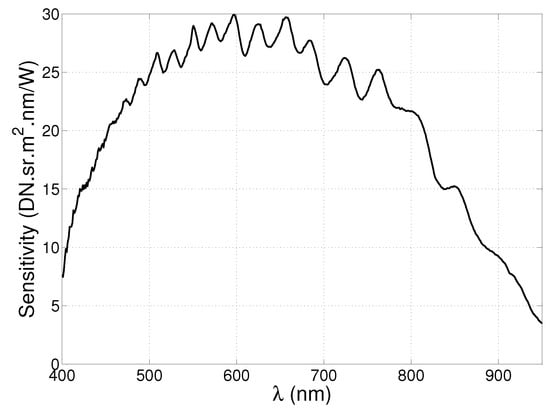 An absolute radiance calibration of the camera was performed by measuring the spectrum of an Optronic Laboratories OL455 integrating sphere calibration source with a halogen lamp (Orlando, FL, USA). The same spectrum was measured with a National Institute of Standards and Technology (NIST) traceable JETI Specbos 1211 spectroradiometer (Jena, Germany). The sensitivity of the imaging system is obtained as the ratio of these two spectra and can be used to correct the measurements made during the experiments. The sensitivity of the hyperspectral imaging system is plotted in Figure 2 as a function of wavelength. The ripple that can be seen in this plot is an interference pattern that results from the presence of different layers of material at the sensor surface. Denoting the sensitivity at wavelength by , and the measured value of the pixel corresponding to wavelength by , a measurement can be converted into an absolute radiance value as follows: