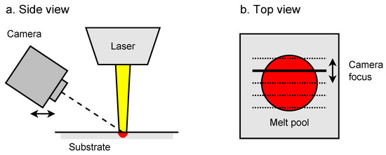 A laser melting experiment was performed by focusing an IPG YLS-1000 fiber laser (Oxford, MA, USA) with a center wavelength of 1070 ± 10 nm on a 20 mm thick substrate of AISI 316L stainless steel. This resulted in the creation of a melt pool that maintained a stable size after a few seconds of irradiation. A flow of argon gas was directed towards the substrate in order to minimize oxidation of the melt pool surface. A flat top laser beam was used with a diameter of 1200 µm in the focus plane and with a total laser power of 250 W. Due to the presence of the laser head, the camera could not be positioned perfectly normal to the melt pool surface and was positioned at an angle of 38 degrees relative to the surface normal. Measurements were made at different locations by horizontally displacing the camera so that a complete temperature profile of the melt pool surface could be obtained. A schematic overview of the measurement setup is given in Figure 3.