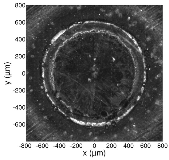 A microscope image of the substrate surface taken after irradiation with the laser beam is shown in Figure 4. The image was taken with a resolution of 5 µm/pixel. The outer circle that can be seen in the image has a diameter of 1200 µm and encloses the area that was irradiated by the laser beam. The smaller inner circle has a diameter of ca. 960 µm and marks the region that was in a fully liquid state during the experiment, i.e., the melt pool. The small region between these two circles is called the mushy region [41] and contains the material that was in a partially solid and liquid state.