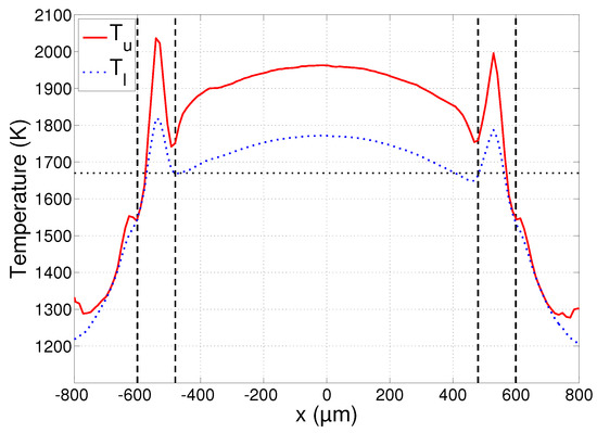 While the measurements may not contain reliable quantitative information about the temperature in this region, the emissivity plot of Figure 7 still presents some useful information: the spatial boundaries of the mushy region can clearly be identified as the emissivity peaks at and . This is in correspondence with the mushy region boundaries identified in the microscope image in Figure 4. The temperature estimates at these boundaries are approximately 1550 K and 1700 K. This interval correctly includes the melting point of AISI 316L stainless steel, which is approximately 1670 K [42]. The melting point is indicated on the plot of Figure 6 as the dotted horizontal line.
