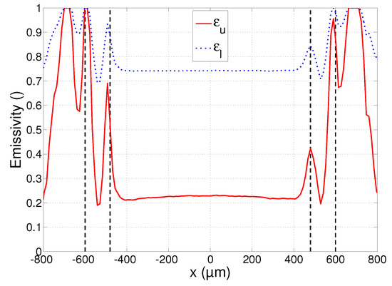 The profiles of the estimated lower and upper emissivity bounds and are plotted in Figure 7. The emissivity estimation errors are larger than those of the temperatures. They are again smallest in the region , where and , and larger at , where and .