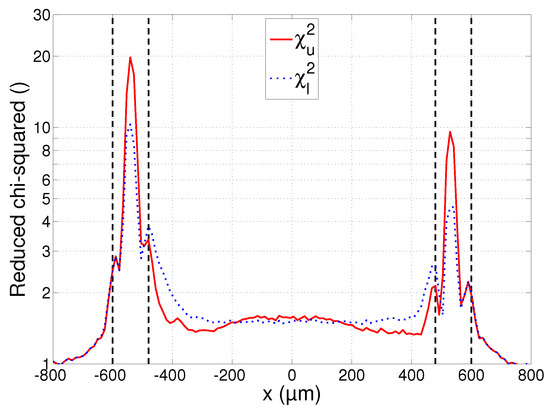 A final plot that will be used in the subsequent discussions is that of the chi-squared statistics and , calculated using Equation (7). The plot is shown in Figure 8 and will provide an indication of the reliability of the estimates. It must be remarked that the small asymmetry that can be noticed in all the plots of Figure 6, Figure 7 and Figure 8 is due to the imperfect alignment of the camera with the substrate surface and resulted in the right parts of the images being slightly more out of focus than the left parts.