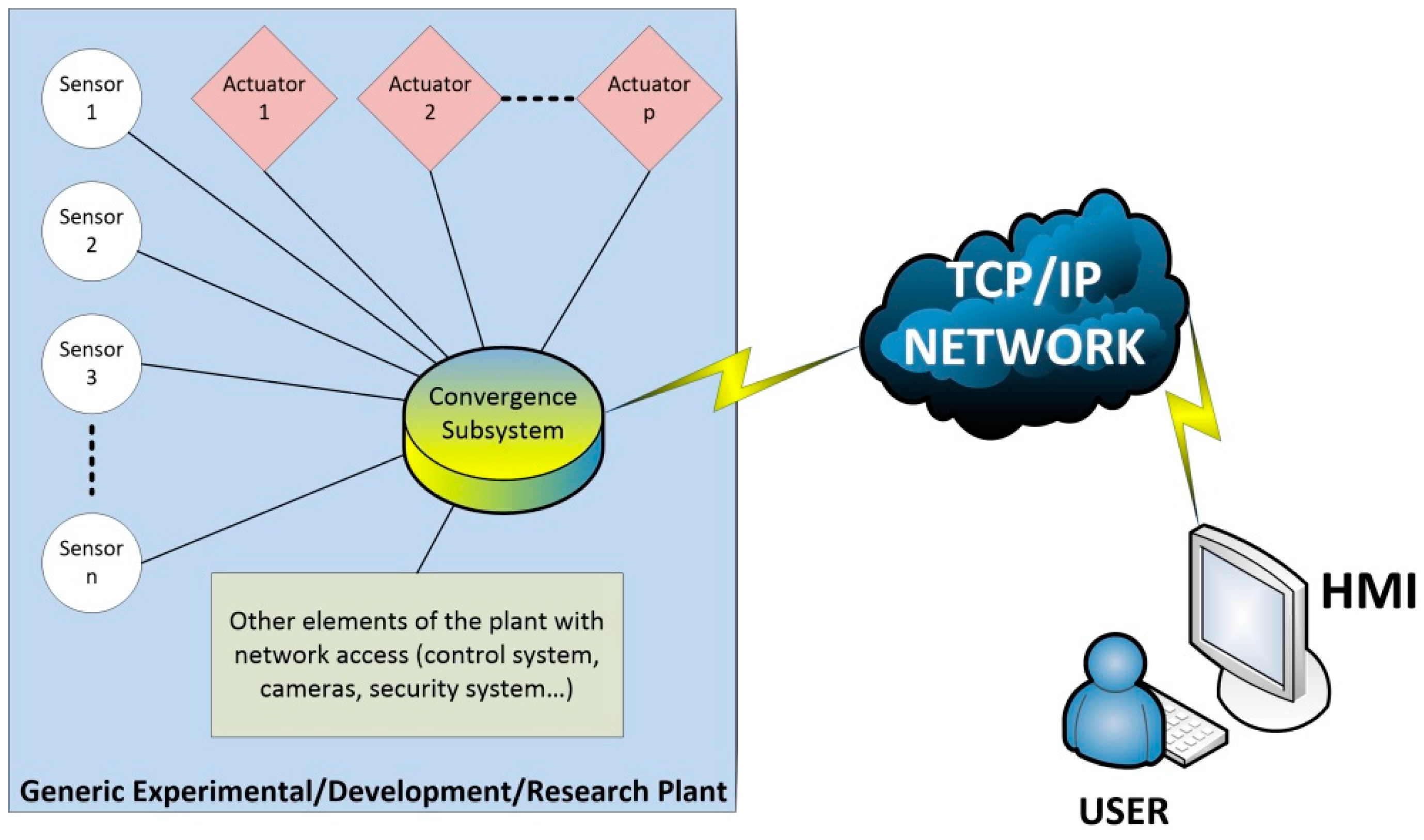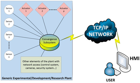 Therefore, the HMI and the convergence subsystem have to be implemented to achieve the remote use of a plant of any type—experimental, development or research plant. Figure 1 shows the complete diagram that integrates the convergence subsystem, the HMI and the rest of the parts involved in a remote access to a plant.